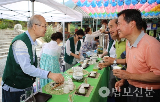 ▲ 안동일 염불만일회 회장은 첫날 저녁예불을 마친 뒤 염불정진에 앞서 회원들과 차담을 나누며 지난 대회의 추억과 함께 20차년도의 감동을 나눴다.